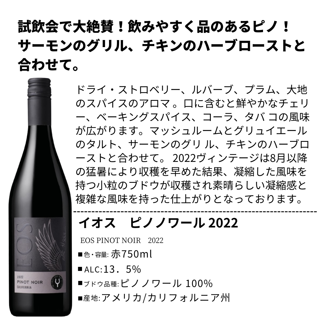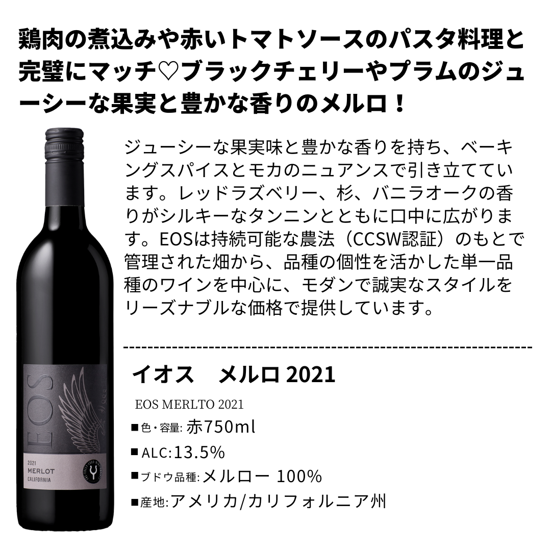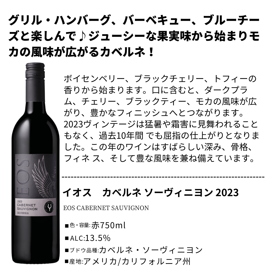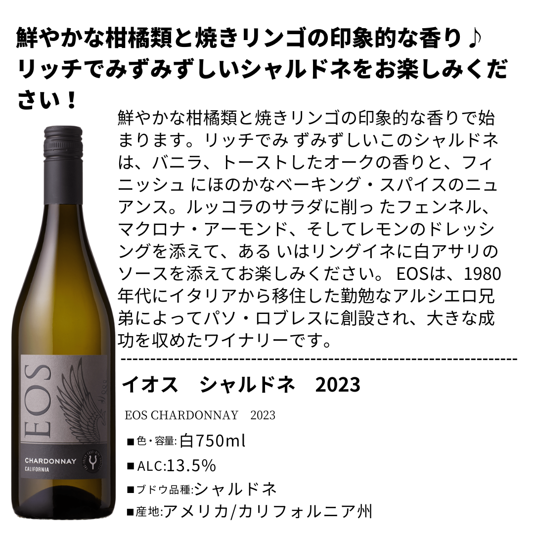 EOS(イオス)は、1980年代にイタリアから移住した勤勉なアルシエロ兄弟によってパソ・ロブレスに創設され、大きな成功を収めたワイナリーです。2010年には、ビル・フォーリー率いるフォーリー・ファミリー・ワインズに加わり、新たな時代を迎えました。ブランド名の“EOS”は、毎朝天の門を開けて太陽を昇らせるギリシャ神話の暁の女神イオスに由来しています。情熱的な性格ゆえに呪いを受けた彼女の物語になぞらえ、EOSではすべてのブドウが夜明け前に手摘みで収穫され、その情熱はワイン造りに注がれています。現在は、パソ・ロブレス単一の畑に限定されていた以前と異なり、冷涼な沿岸部を含む高品質な自社畑のブドウを使用。これにより、ワインのクオリティは格段に向上し、果実味とバランスに優れた味わいが特徴となっています。持続可能な農法(CCSW認証)のもとで管理された畑から、品種の個性を活かした単一品種のワインを中心に、モダンで誠実なスタイルをリーズナブルな価格で提供しています。