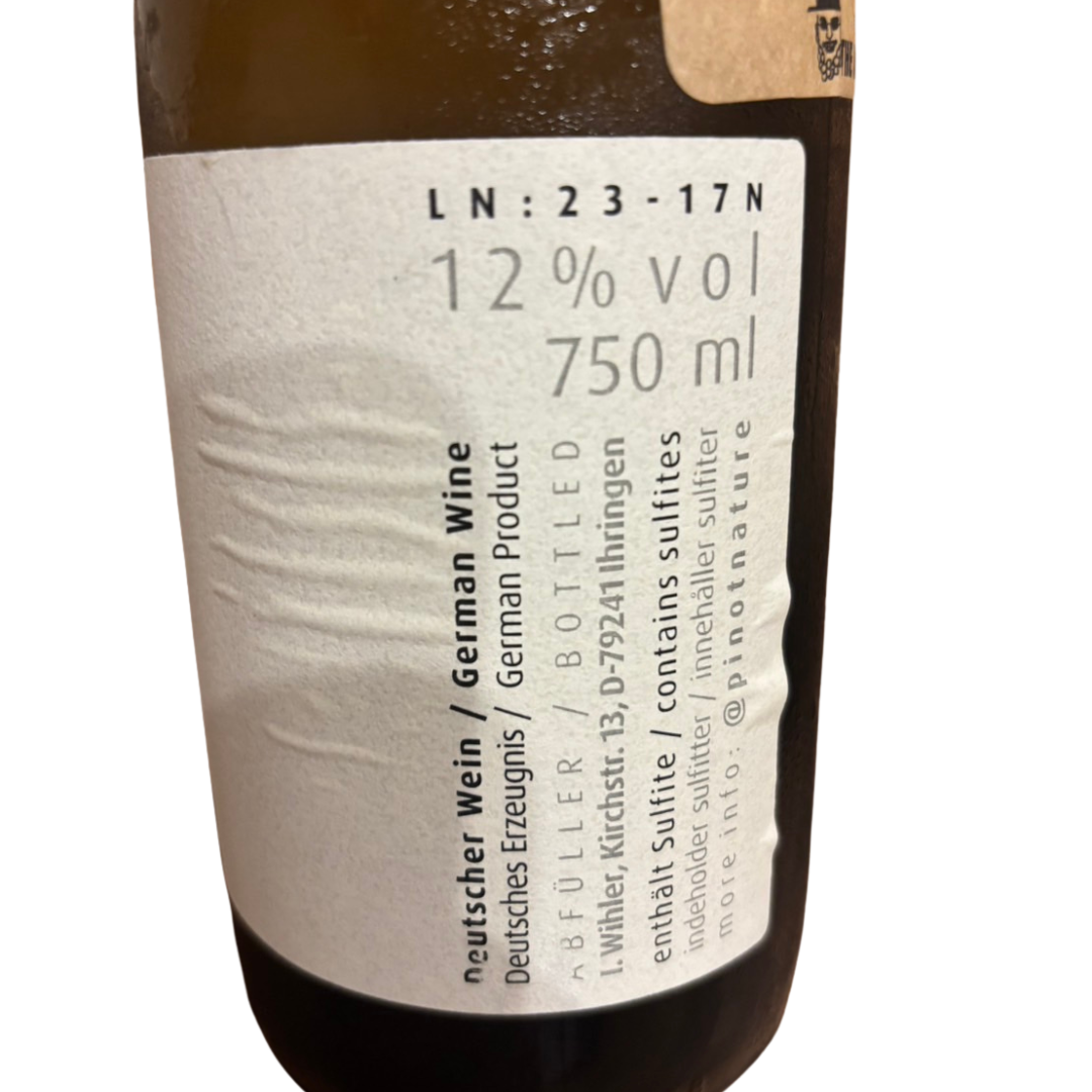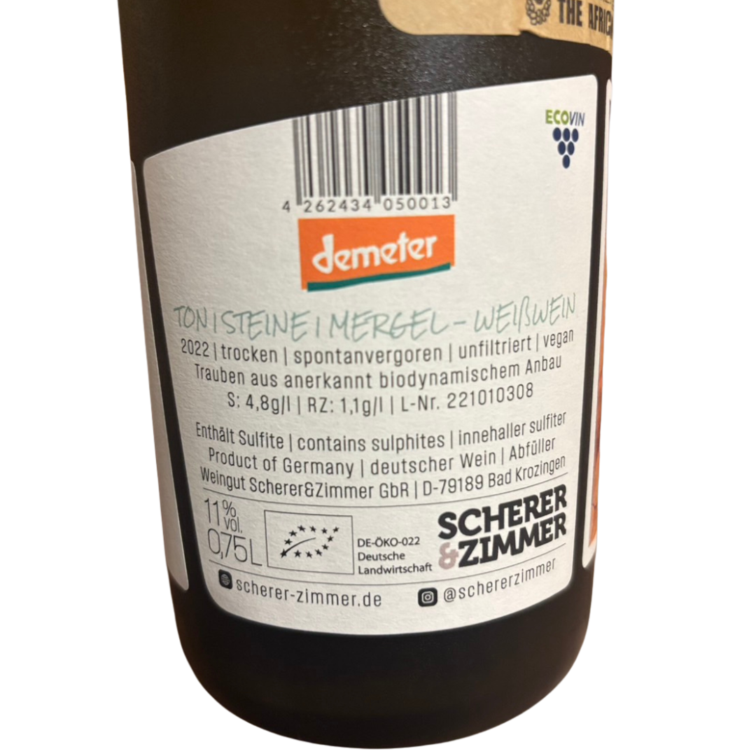 カイザーシュトゥール地区イーリンゲン村のオーガニックのぶどう(黄土、ローム、火山岩)を使用。手摘みで収穫、選果後、足で破砕し、全房で短時間(5時間)のスキンコンタクト。その後、丁寧にゆっくりとプレス。ステンレスタンクに移し、発酵。シュールリーにて14ヵ月間熟成。ノンフィルター、酸化防止剤なしで瓶詰め。ラベルは、祖母のエリカさんの肖像画で友人のフライブルク出身のマイケルが描いております。